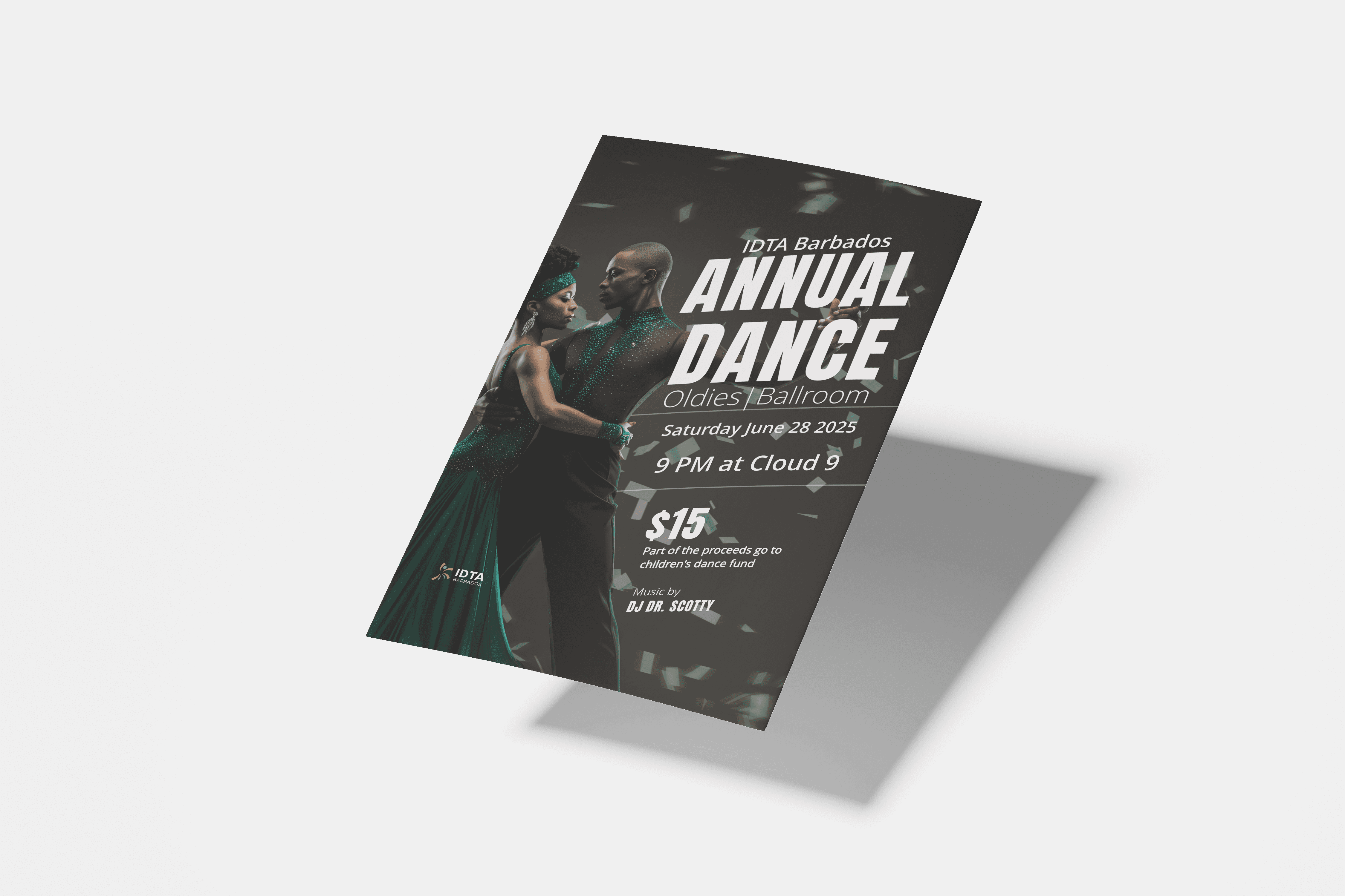 The 2nd concept features a minimalist “IDTA” wordmark with an abstract petal or leaf motif (pride of Barbados) symbolising movement, creativity, and inclusivity, aligning with the Council’s goal to attract diverse dance styles. Its clean, approachable typography and layout make it youth-friendly.